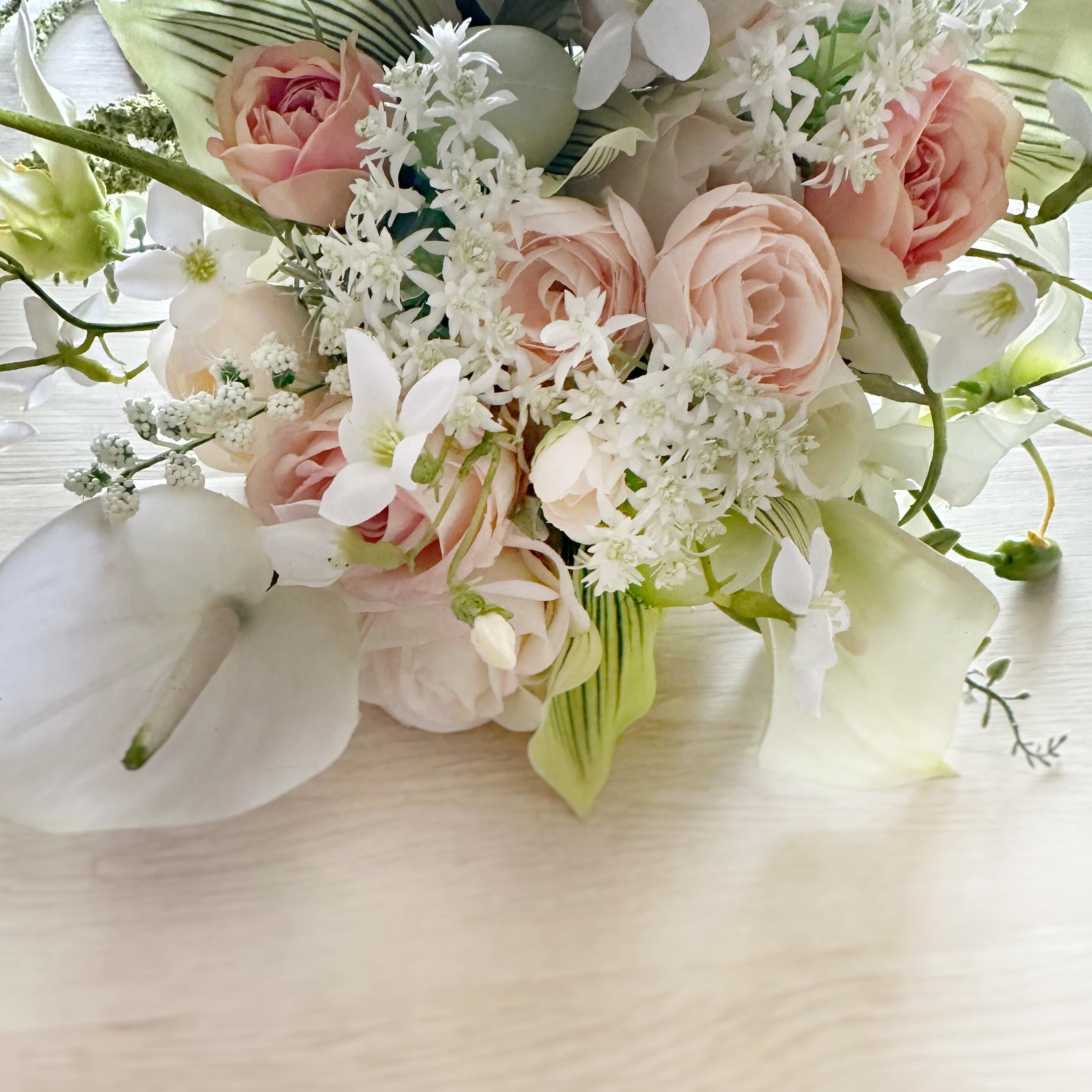 ■花材は繊細なつくりです。発送前の検品や梱包には最善を尽くしておりますが、配送中に花材が落ちてしまうことがあります。その場合であってもデザインに大きく影響が出ない範囲であれば、現在の造花材の特性としてご理解、ご容赦ください。