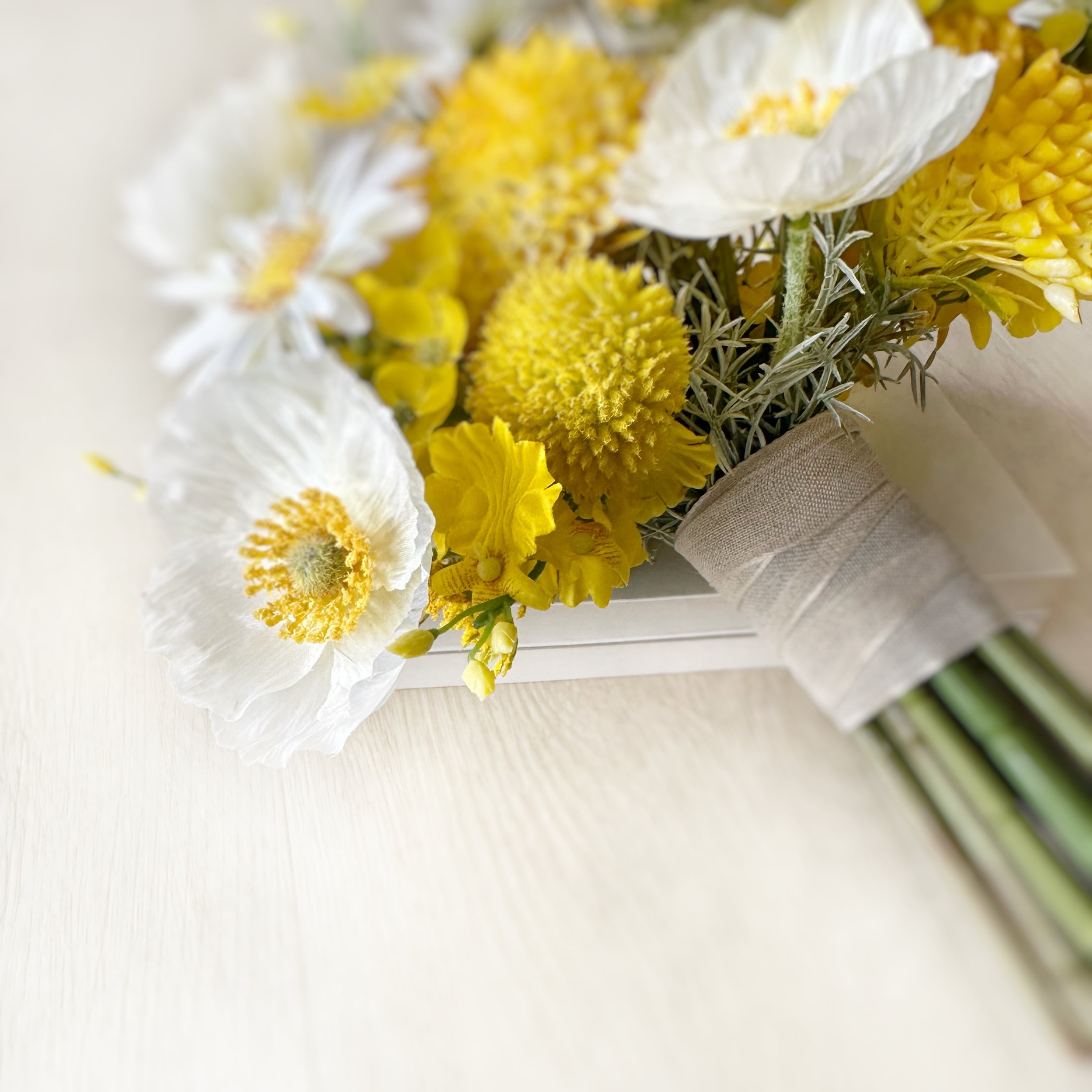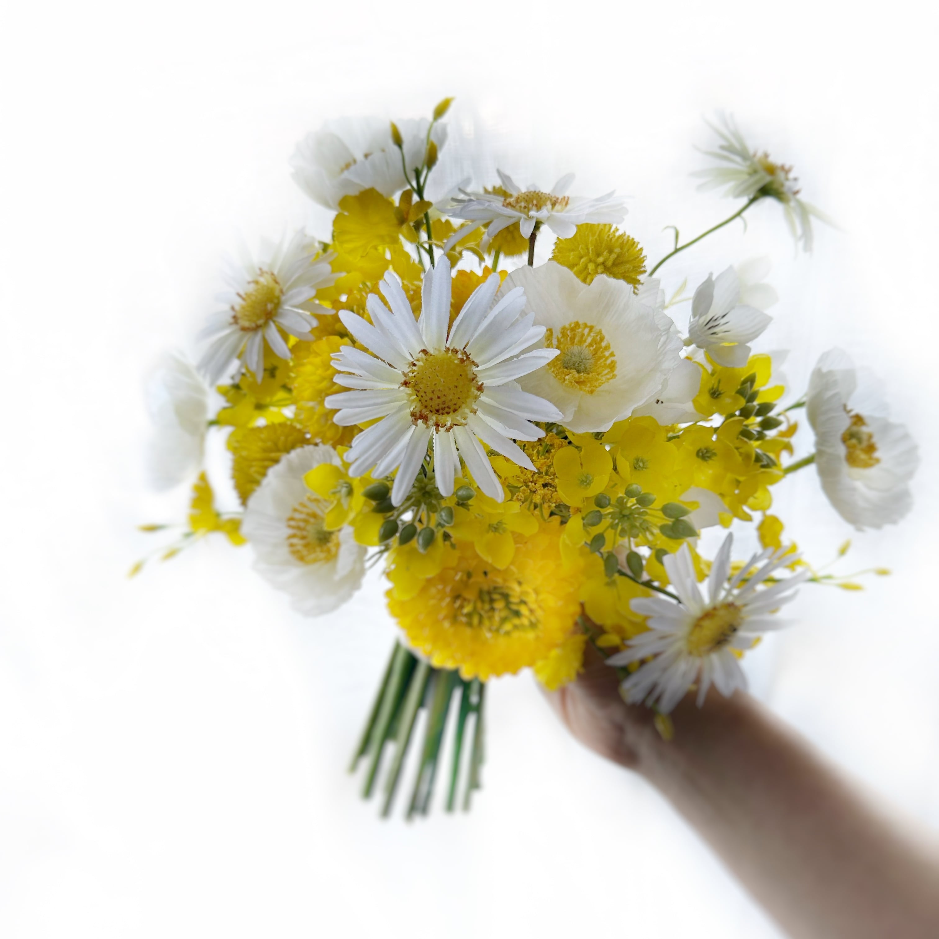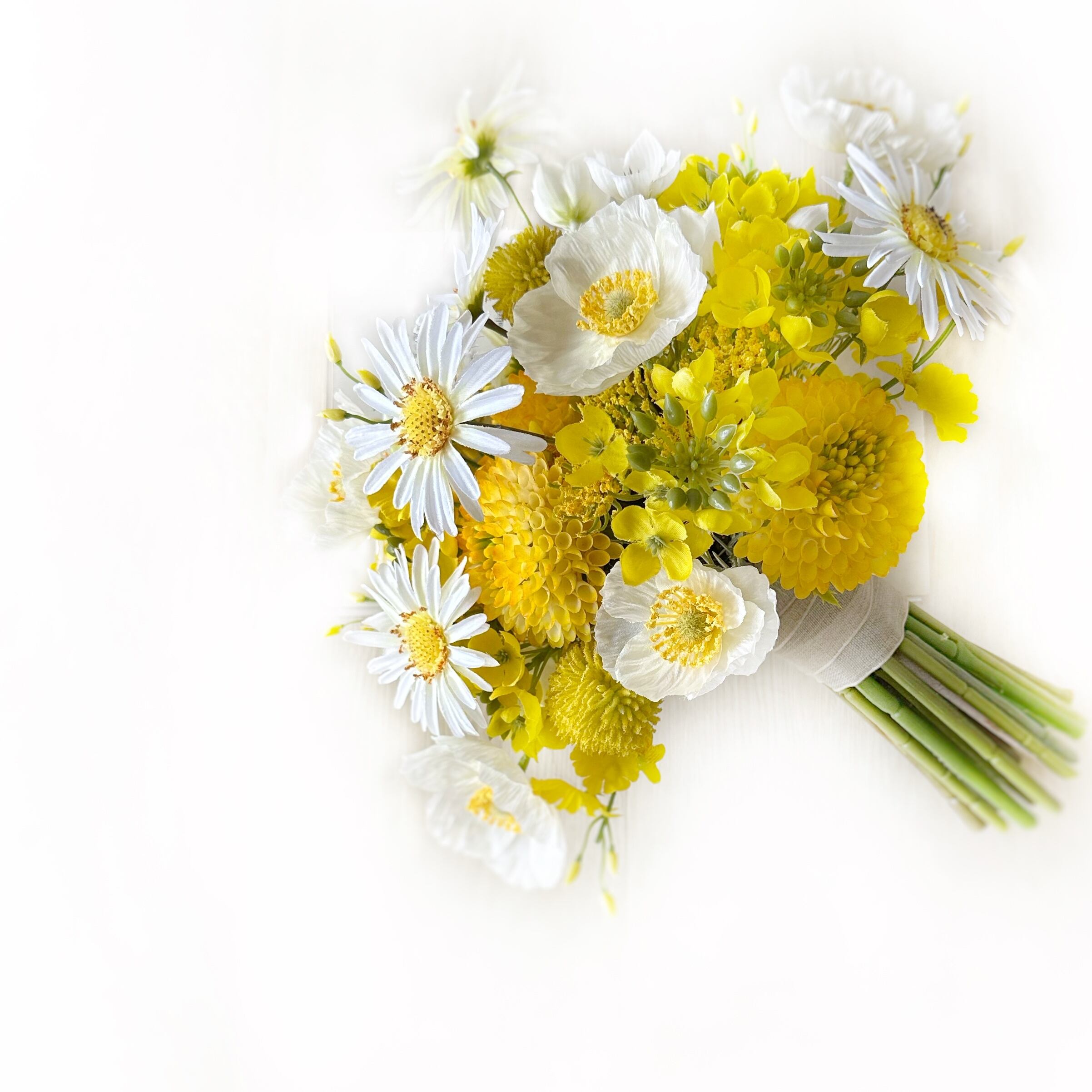 黄芯に白い花びらのデージーやポピーに優しいイエローの花々を合わせ束ねたウェディングブーケです。