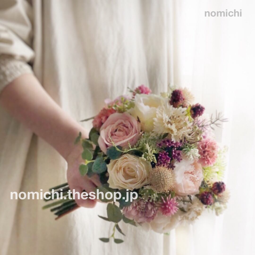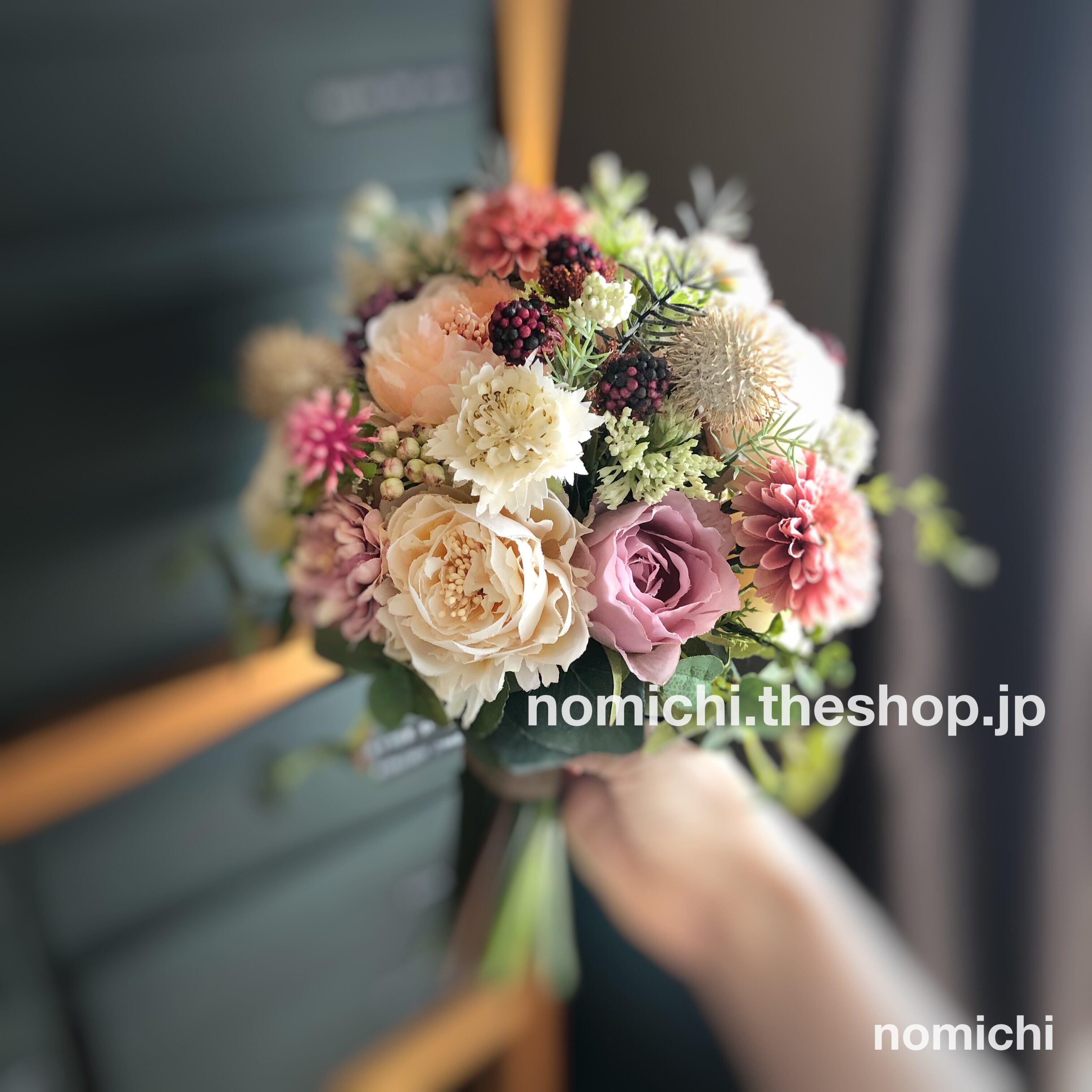 アンティーク な風情をイメージし、花の素材や色味を厳選しました。近くでじっと見てナチュラルで楽しく、遠くから見てもアンティーク ピンクの美しい雰囲気を纏った、大人可愛い世界観あふれるブーケです。