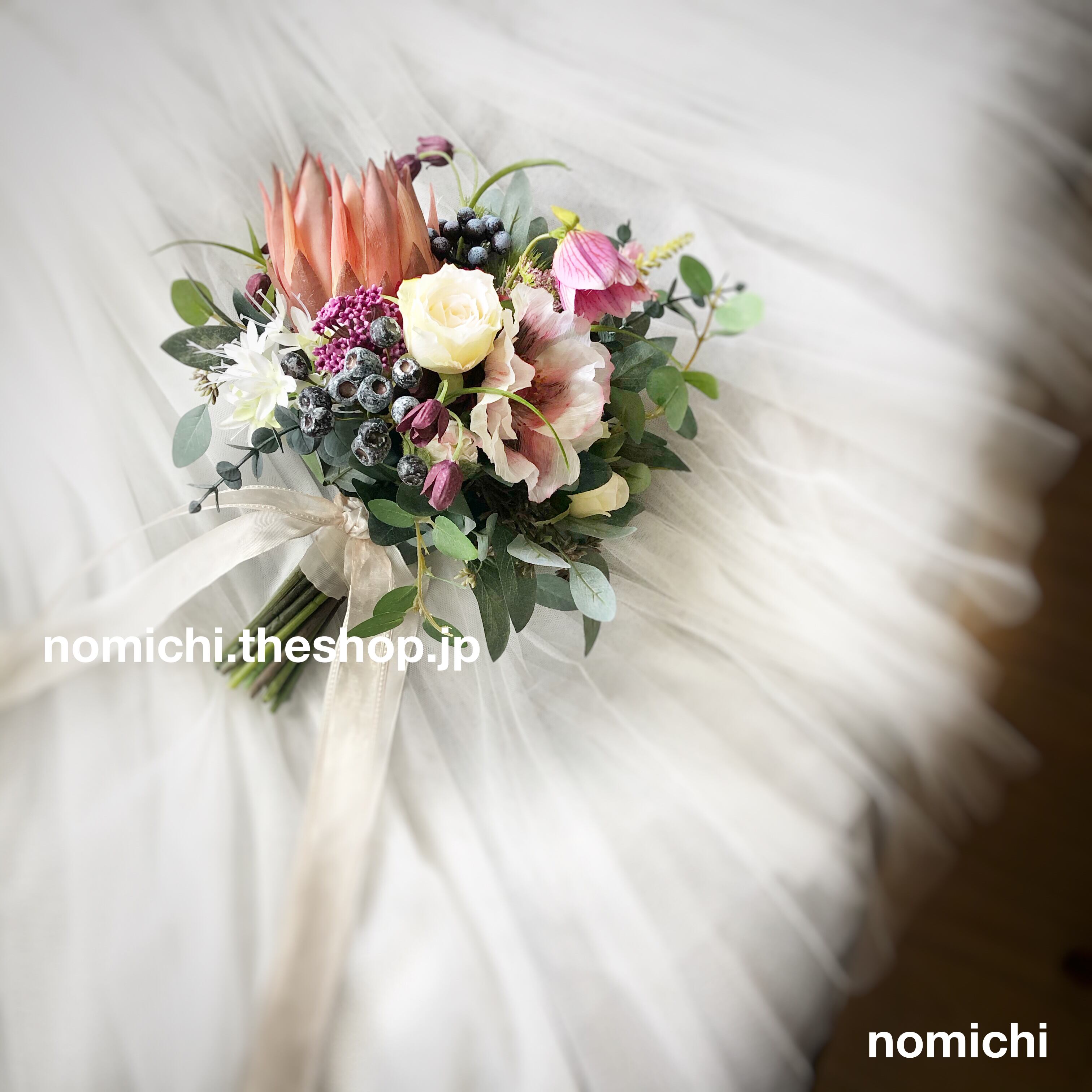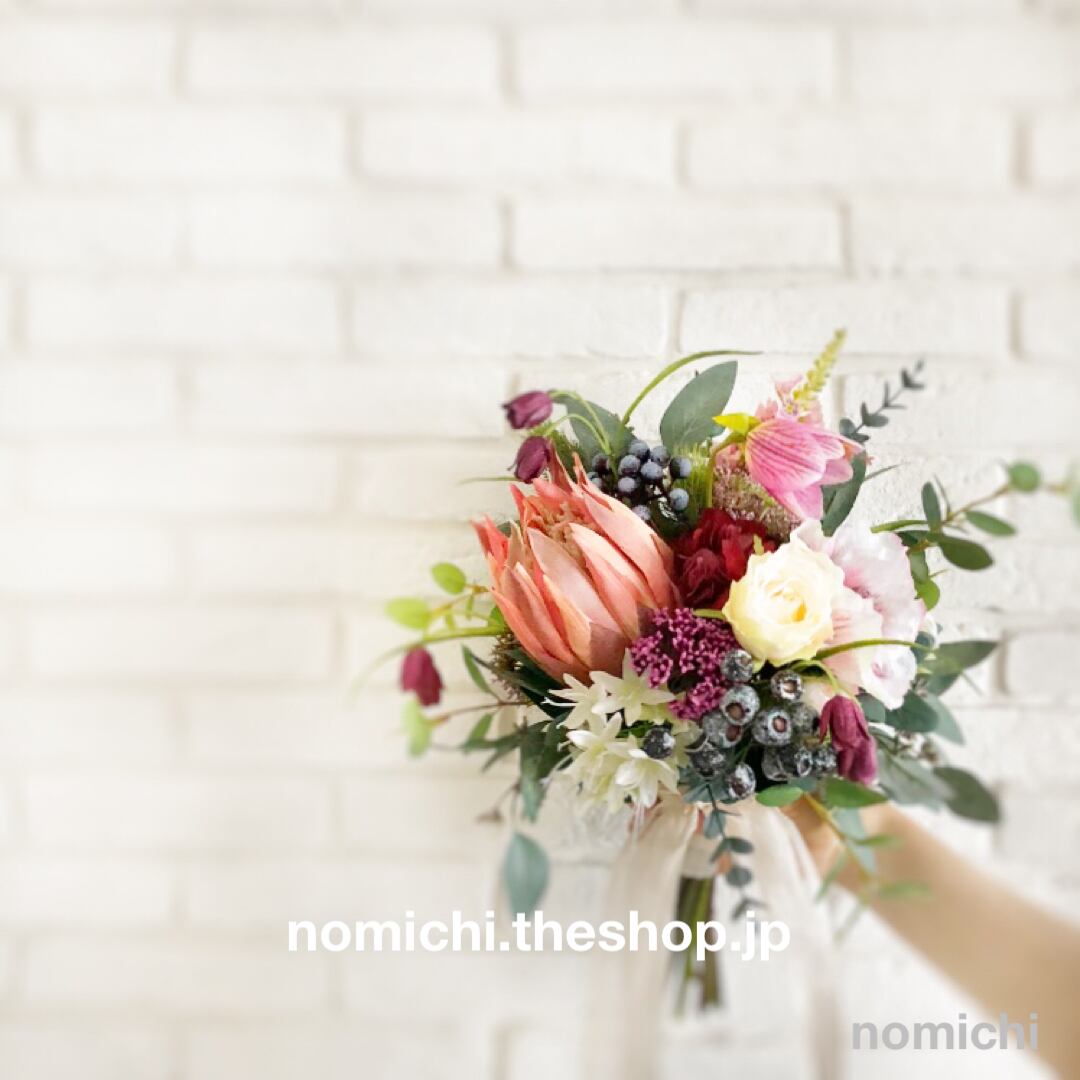 ワイルドな雰囲気のプロテアに、あえて女性らしく柔らかい花々を合わせてロマンチックに♪重ねづけした2種類のリボンは、軽やかに風になびきます。茎を生かしたクラッチブーケならではのナチュラル感も魅力です。