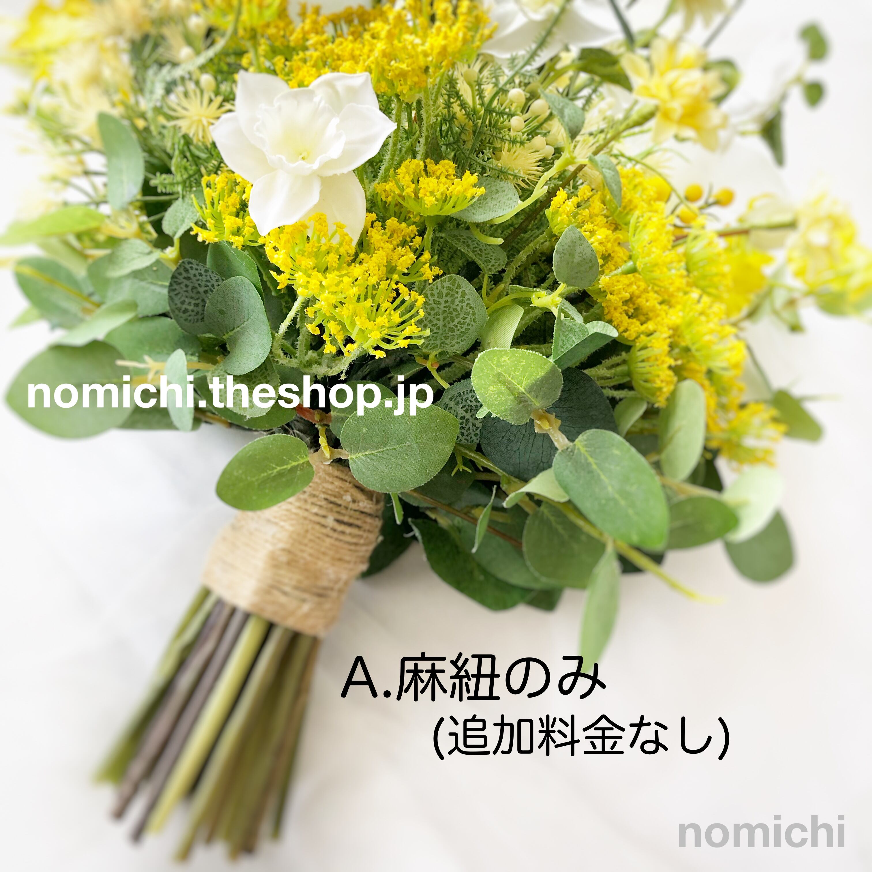 麻紐を巻いた部分の上部に、2種の重ねづけで結びます。ブートニアには、オフホワイトのリボン1種をお付けします。